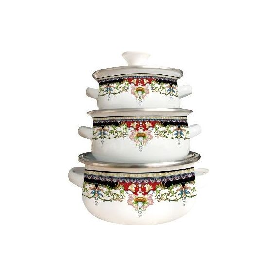 Набор из 6 предметов; Кастрюли: 0,5л, 0,7л, 1,1 л; С жаропрочными стеклянными крышками; 3-х слойное внешнее эмалированное покрытие; 3-х слойное внутреннее эмалированное покрытие; Подходит для индукционных плит.