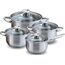 Набор посуды из 8 предметов; Выполнен из нержавеющей стали лучшего качества; Кастрюля маленькая, объемом 2 литра; Кастрюля средняя, объемом 2,6 литра; Кастрюля большая, объемом 3,6 литра; Сотейник, объемом 2 литра; Внутреннее покрытие: нержавеющая сталь; 5-тислойное капсульное дно; Материал крышки жаропрочное стекло; Материал корпуса: нержавеющая сталь; Подходит для индукционных плит