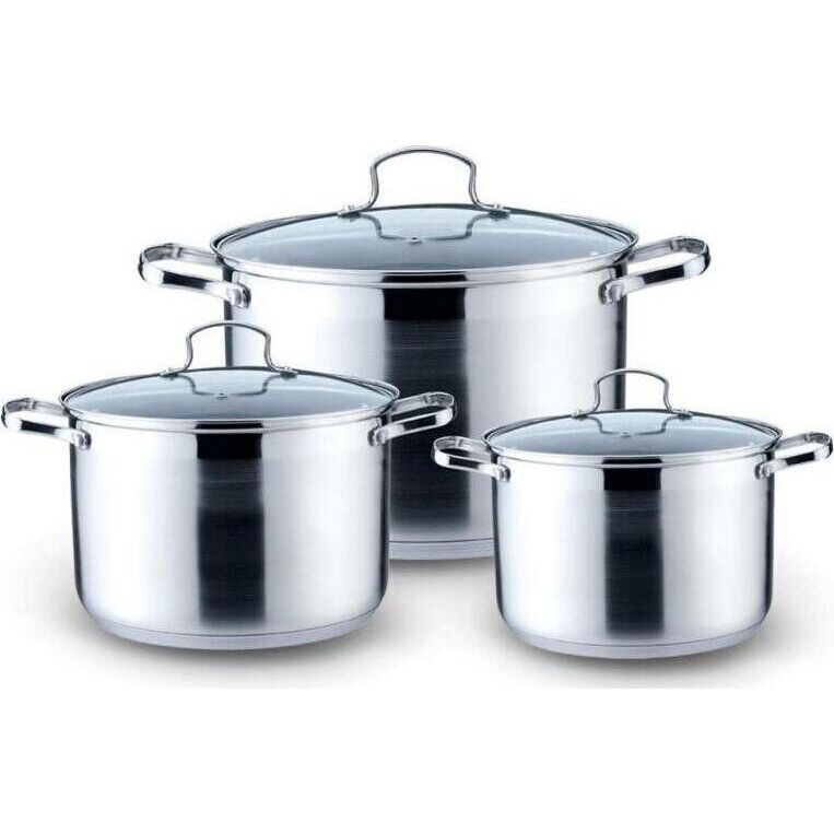 Набор из 6 предметов; Кастрюля с жаропрочной стеклянной крышкой 5л; Кастрюля с жаропрочной стеклянной крышкой 6,6л; Кастрюля с жаропрочной стеклянной крышкой 8л; Диаметр изделий составляет: 22 см, 24 см, 26 см; Высококачественная нержавеющая сталь 18/10; 5-ти слойное капсульное дно; Мерная шкала внутри; Подходит для всех видов плит, включая индукционные; Можно мыть в посудомоечной машине.