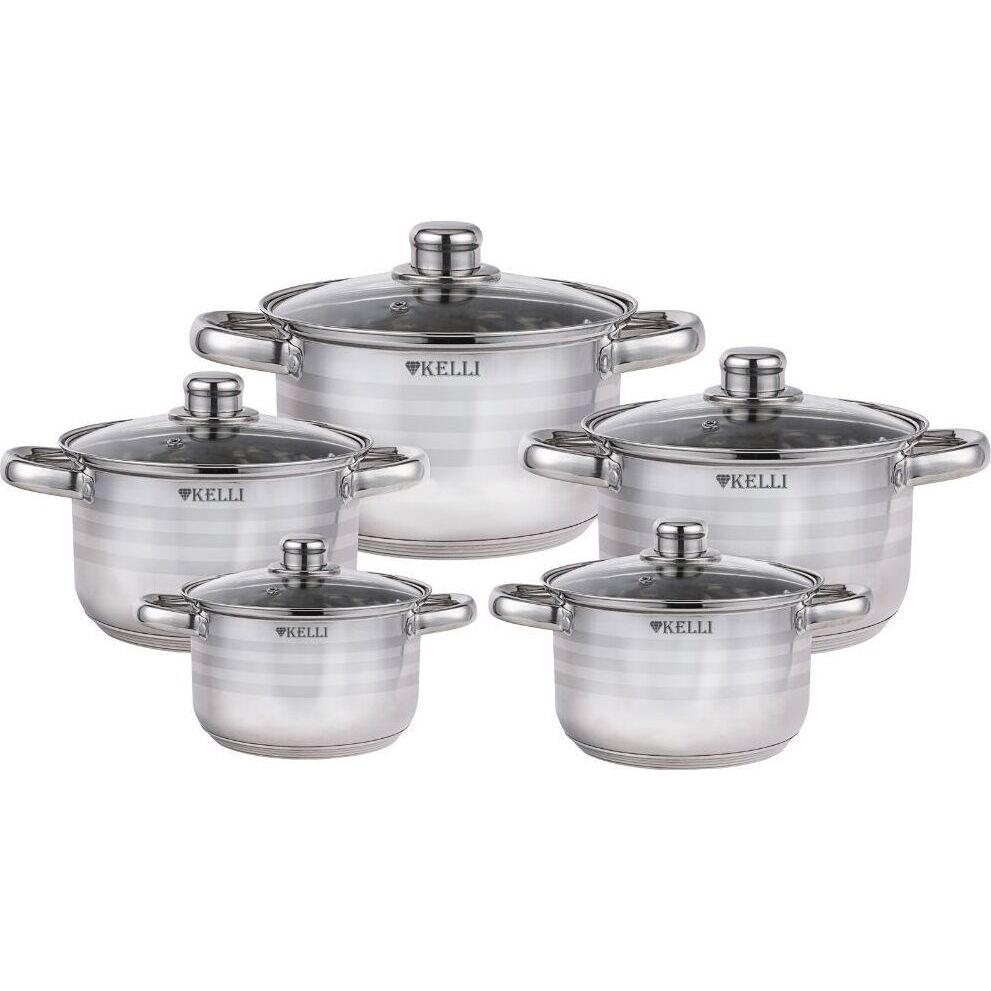 Набор посуды из 10 предметов; Материал: нержавеющая сталь; Кастрюля 2л со стеклянной крышкой, диаметр: 16 см; Кастрюля 2,5л со стеклянной крышкой, диаметр: 18 см; Кастрюля 3,5л со стеклянной крышкой, диаметр: 20 см; Кастрюля 4,5л со стеклянной крышкой, диаметр: 22 см; Кастрюля 5,5л со стеклянной крышкой, диаметр: 24 см; Удобные клепаные ручки не нагреваются; Крышки с паровыпуском; 5-ти слойное капсульное дно; Мерная шкала; Подходит для всех видов кухонных плит