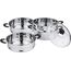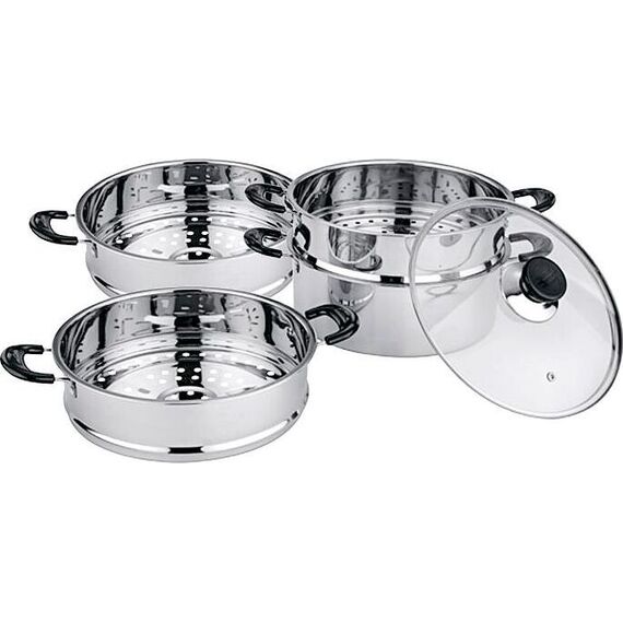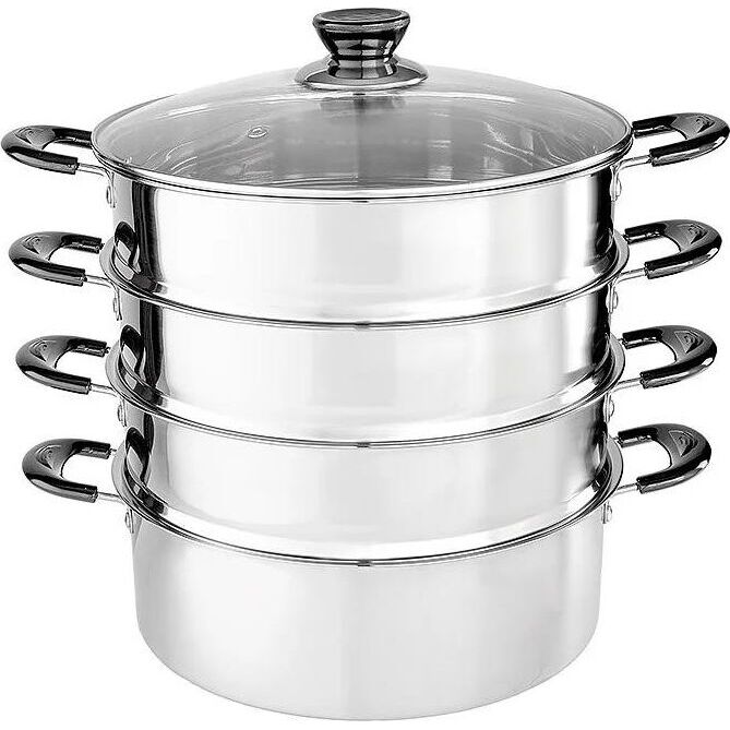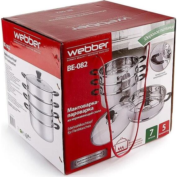 WEBBER BE-082 Параметры В наборе 5 предметов: кастрюля для воды O24х11,5см; 7л, из нержавеющей стали 1 штука крышка O24см стеклянная 1 штука паровая емкость O24х7см, из нержавеющей стали, съемная, с сетчатым дном 3 штуки Толщина стали 0,5 мм Описание Мантоварка-пароварка 4-х уровневая Высококачественная нержавеющая сталь Индукционное дно, прозрачная стеклянная крышка. Благодаря особому дизайну крышки пар, образующийся в процессе приготовления, собирается в центре крышки и, конденсируясь, капает на дно мантоварки Термостойкие бакелитовые ручки Специальная форма, исключающая скопление остатков пищи и жира Обод, препятствующий переливанию жидкостей через край Быстрый нагрев пищи, длительное удержание тепла Минимальные потери минеральных веществ, витаминов и вкусовых качеств Пригодна для использования на всех типах кухонных плит, включая индукционные.Подходит для мытья в посудомоечной машине