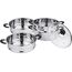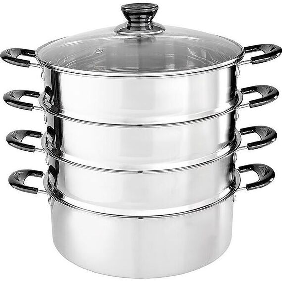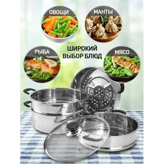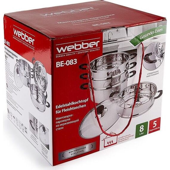 WEBBER BE-083 Параметры В наборе 5 предметов: кастрюля для воды O26х12,5см; 8л, из нержавеющей стали 1 штука крышка O26см стеклянная 1 штука паровая емкость O26х7,5см, из нержавеющей стали, съемная, с сетчатым дном 3 штуки Толщина стали 0,5 мм Описание Мантоварка-пароварка 4-х уровневая Высококачественная нержавеющая сталь. Индукционное дно. Прозрачная стеклянная крышка позволяет следить за приготовлением пищи. Благодаря особому дизайну крышки пар, образующийся в процессе приготовления, собирается в центре крышки и, конденсируясь, капает на дно мантоварки. Термостойкие бакелитовые ручки. Специальная форма, исключающая скопление остатков пищи и жира. Обод, препятствующий переливанию жидкостей через край. Быстрый нагрев пищи, длительное удержание тепла. Минимальные потери минеральных веществ, витаминов и вкусовых качеств. Пригодна для использования на всех типах кухонных плит, включая индукционные. Подходит для мытья в посудомоечной машине.