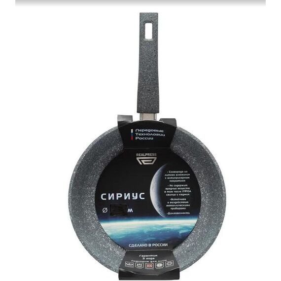 Сковорода REALPRESS 22 см серии СИРИУС с несъемной ручкой изготовлена в России из литого алюминия с многослойным антипригарным покрытием. Антипригарное покрытие наносится методом распыления под высоким давлением, что обеспечивает его жесткое сцепление с поверхностью металла. Это является гарантией длительного срока службы сковороды. Покрытие не содержит вредных веществ, в том числе ПФОА, свинца и кадмия, состоит из натуральных компонентов, не выделяет при эксплуатации посторонних веществ, устойчиво к непреднамеренному воздействию металлическими приборами. Сковорода имеет толстые стенки (около 3,5 мм) и утолщенное дно (около 6,5 мм). Сковороды RealPress идеально подходят для приготовления любых видов блюд: мясо, овощи, омлеты, блины, оладьи, гарниры, плов, в ней можно бережно тушить и готовить полезную и здоровую еду практически без использования масла! Благодаря равномерному нагреву и распределению тепла при их использовании можно не пережаривать пищу. Сковороды можно использовать на газовых, электрических, с