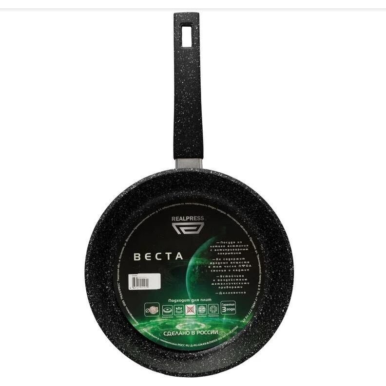 Сковорода ВЕСТА с несъемной ручкой изготовлена в России из литого алюминия с многослойным антипригарным покрытием. Антипригарное покрытие наносится методом распыления под высоким давлением, что обеспечивает его жесткое сцепление с поверхностью металла. Это является гарантией длительного срока службы сковороды. Покрытие не содержит вредных веществ, в том числе ПФОА, свинца и кадмия, состоит из натуральных компонентов, не выделяет при эксплуатации посторонних веществ, устойчиво к непреднамеренному воздействию металлическими приборами. Сковорода имеет толстые стенки (около 3,5 мм) и утолщенное дно (около 6,5 мм). Сковороды RealPress идеально подходят для приготовления любых видов блюд: мясо, овощи, омлеты, блины, оладьи, гарниры, плов, в ней можно бережно тушить и готовить полезную и здоровую еду практически без использования масла Благодаря равномерному нагреву и распределению тепла при их использовании можно не пережаривать пищу. Сковороды можно использовать на газовых, электрических