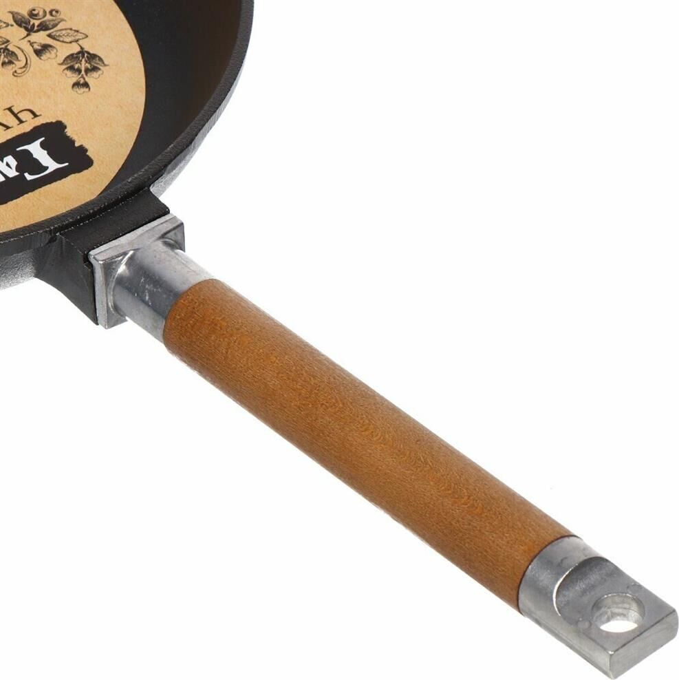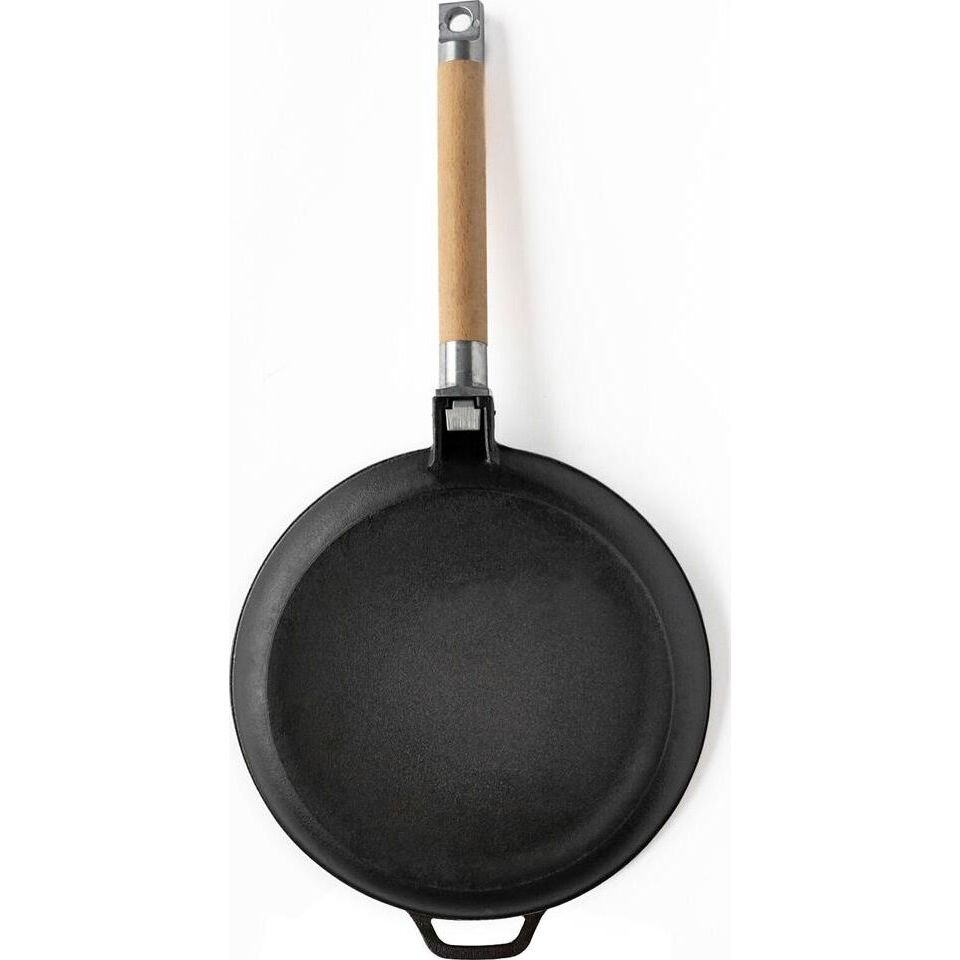 Сковорода отличается надежностью, прочностью и долговечностью эксплуатации. Ее можно использовать на всех видах нагревательных поверхностей, включая газовые и индукционные плиты, а также на открытом огне. Модель диаметром 26 см выполнена из чугуна, обладающего высокой теплопроводностью, что значительно ускоряет кулинарные процессы и делает блюда особенно вкусными. Устойчивое к появлению царапин внутреннее покрытие позволяет применять во время приготовления пищи металлические лопатки и ложки для переворачивания и перемешивания ингредиентов, не опасаясь повредить поверхность. Особенность конструкции сковороды заключается в изготовленной из дерева съемной ручке, которая оснащена петлей, позволяющей удобно хранить изделие в подвешенном виде. Ручка легко снимается, благодаря чему модель подходит для создания блюд в духовом шкафу и существенно экономит место в холодильнике. Характеристики: Материал: чугун; Материал ручки: дерево, алюминий; Диаметр: 26 см; Цвет: черный, коричневый; Съемная ручка: да;