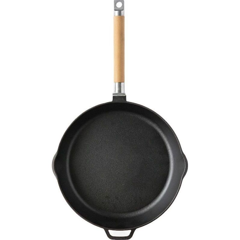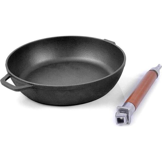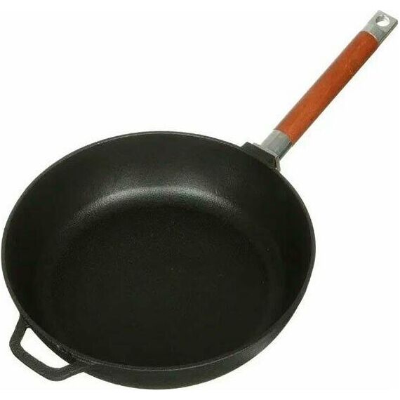 Сковорода изготовлена из натурального экологически безопасного чугуна. Чугун является одним из лучших материалов для производства посуды. Сковороду можно нагревать до высоких температур, она практична, не выделяет токсичных веществ, обладает высокой теплоемкостью и способна служить десятилетиями. Сковорода оснащена съемной деревянной ручкой. При помощи вращательного движения ручка снимается и прикручивается. Подходит для всех типов плит, включая индукционные. Нельзя мыть в посудомоечной машине. Диаметр сковороды по верхнему краю: 26 см. Высота стенки: 6,5 см. Длина ручки: 21 см.