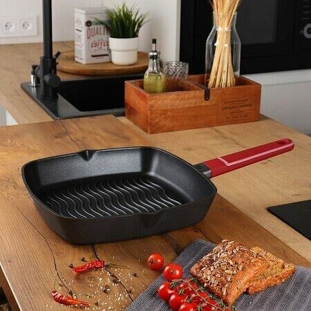 • Сковорода гриль 28 см*28 см Ornament, высота 5.5 см, литая; внешний диаметр дна 19,9 см • Материал корпуса – литой алюминий • Внутреннее покрытие – двухслойное антипригарное покрытие Whitford Xylan Plus • Ручка – бакелитовая • Толщина дна– 4