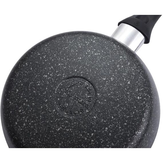 Сковорода а/пр литая 18см Темный мрамор. Подходит для частого применения, идеальна для жарки и тушения при возможности использования минимального количества масла или совсем без него. Можно готовить на любой плите, кроме индукционной. Сковорода имеет отличные теплораспределительные и теплоаккумулирующие свойства, и блюда в ней получаются сочными и ароматными. Мраморное, сверхпрочное, антипригарное покрытие с твердыми частицами натурального мрамора нового поколения на водной основе разработано специально для интенсивного использования на каждый день. Антипригарное покрытие надолго сохраняет первозданную привлекательность посуды, а превосходные антипригарные свойства будут радовать на протяжении очень долгого времени. Допускает использование только деревянных и силиконовых предметов. Покрытие абсолютно безопасно для здоровья, без PFOA. Покрытие не требует особенного ухода, легко моется как вручную, так и в посудомоечной машине (в режиме Eco без предварительного замачивания).