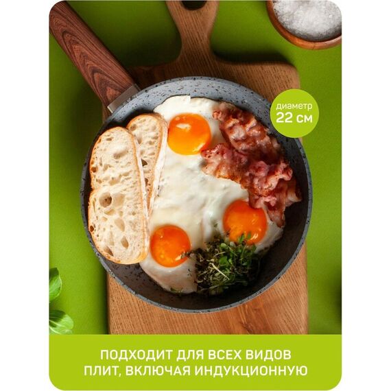 Сковорода. Кованый алюминий. Бакелитовая ручка с мягким напылением. Трехслойное антипригарное усиленное покрытие "Гранит", стандарт Pfluon. Толщина покрытия 35-40мкр. Диаметр по верху (крышка): 22см, высота бортика 44мм, толщина дна 3 мм, Подходит для всех видов плит, в том числе для индукционной.