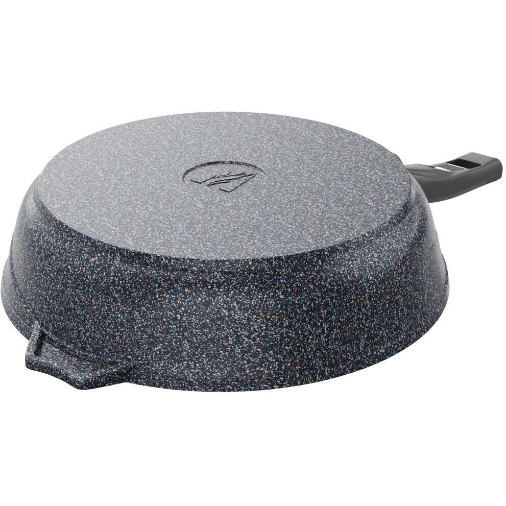 Сковорода 22 см. с несъемной ручкой из бакелита и стеклянной крышкой. Антипригарное покрытие Greblon Rough на водной основе без PFOA. Серия "Гранит star". Подходит для всех типов плит, кроме индукционных. Можно использовать в посудомоечной машине. Ресурс более 15 000 циклов, толщина покрытия до 55 мкр. Толщина дна 5,5-6мм., толщина стенок 3,6-4мм. Покрытие Greblon позволяет готовить с минимальным количеством масла, сохраняя вкусовые и полезные свойства продуктов. Литой толстостенный корпус не подвержен деформации, а утолщенное дно равномерно распределяет тепло по всей поверхности.