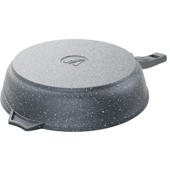 Сковорода 26 см. с несъемной ручкой из бакелита и стеклянной крышкой. Антипригарное покрытие Greblon Rough на водной основе без PFOA. Серия "Гранит". Подходит для всех типов плит, кроме индукционных. Можно использовать в посудомоечной машине. Ресурс более 15 000 циклов, толщина покрытия до 55 мкр. Толщина дна 5,5-6мм., толщина стенок 3,6-4мм. Покрытие Greblon позволяет готовить с минимальным количеством масла, сохраняя вкусовые и полезные свойства продуктов. Литой толстостенный корпус не подвержен деформации, а утолщенное дно равномерно распределяет тепло по всей поверхности.