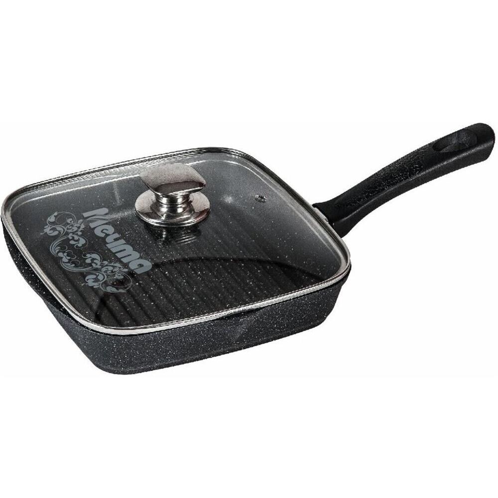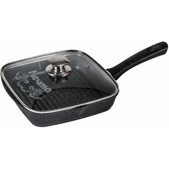 Сковорода-гриль квадр. 28*28 см с антипригарным покрытием, несъемной ручкой и стеклянной крышкой серии "Гранит black". Подходит для всех типов плит, кроме индукционных. Можно использовать в посудомоечной машине.
