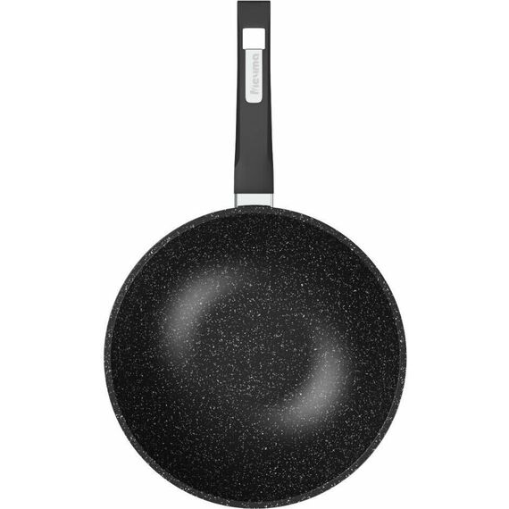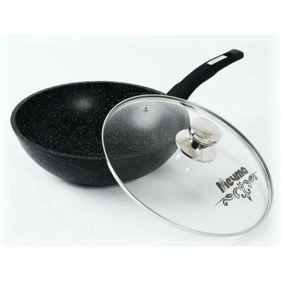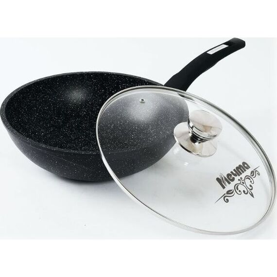 Сковорода ВОК 28см с антипригарным покрытием, несъемной ручкой и стеклянной крышкой серии "Гранит black". Подходит для всех типов плит, кроме индукционных. Можно использовать в посудомоечной машине.