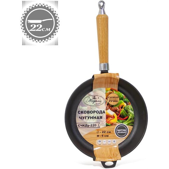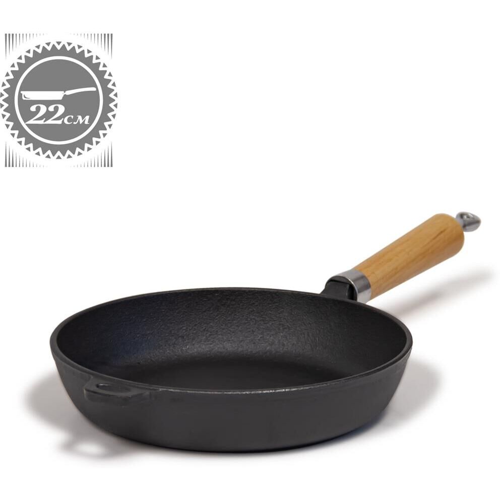 Материал: литейный чугун Деревянная съемная ручка Диаметр: 22 см Высота: 5 см Толщина стенки: 4,0 мм Вес изделия: 2,0 кг/шт (+/-5%)