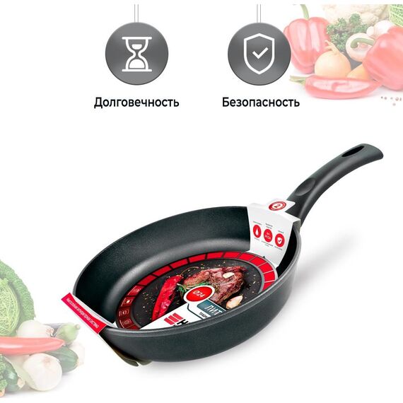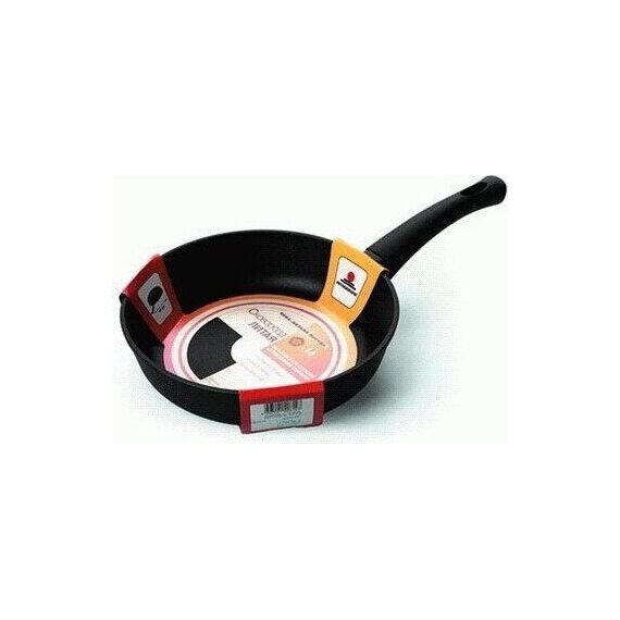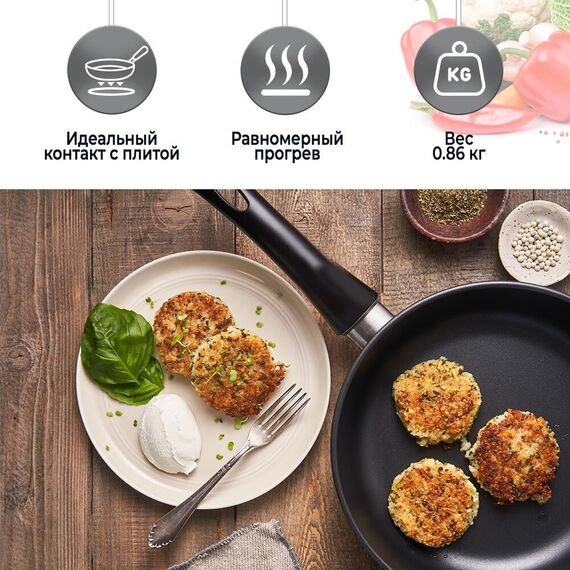 Тип сковорода универсальная. Диаметр 24 см. Антипригарное покрытие Сталафлон. Равномерно нагревается за счет особой конструкции корпуса по принципу "золотого сечения", толстого дна (6 мм) и чуть более тонких стенок (4 мм).