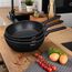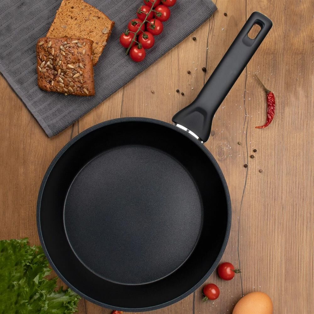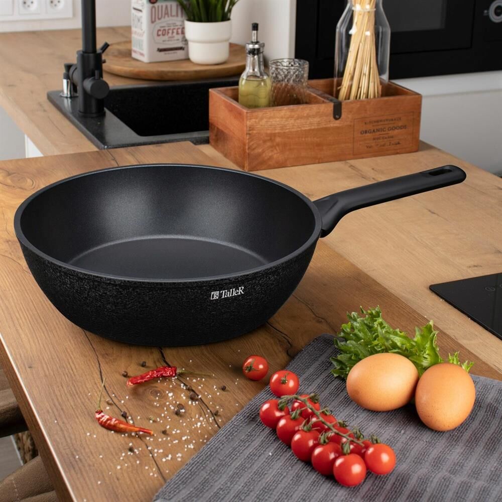 Сковорода глубокая Emily 28 см из кованого алюминия с двухслойным антипригарным покрытием. Толщина дна 4,9 мм, толщина стенок 2,8 мм, высота 7,5 см, внешний диаметр дна 23 см. Бакелитовая ручка с покрытием soft touch нагревается при использовании кон