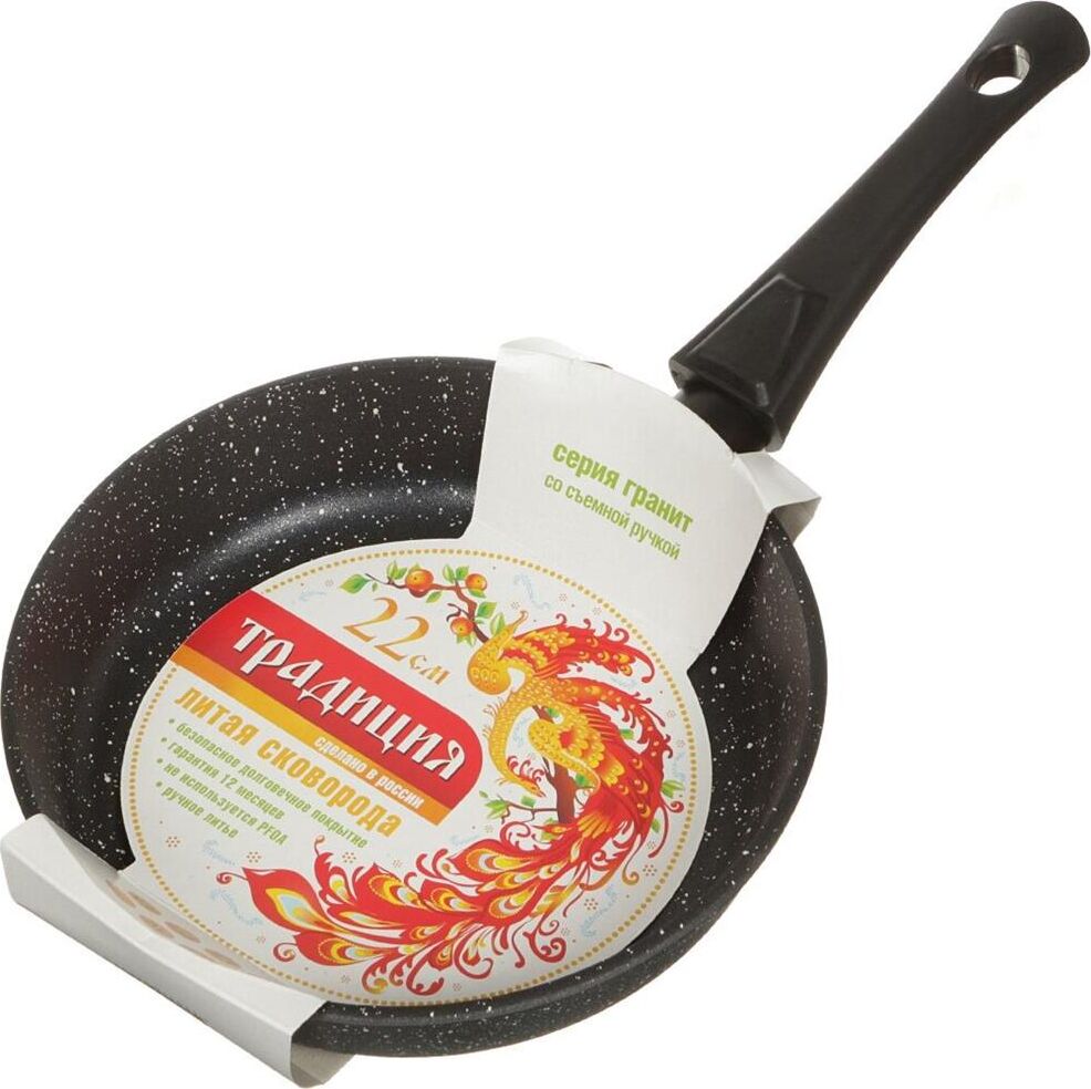 Объем, л./размер, см: 22 см Материал: литой алюминий Коллекция/серия: Гранит Торговая марка: Традиция Толщина дна: 6 Толщина стенок: 3.8 Источник тепла: Все виды плит, кроме индукционной Тип упаковки: цветной рукав Внутреннее покрытие: антипригарное покрытие Pfluon Внешнее покрытие: антипригарное покрытие Pfluon Ручка: съемная soft-touch