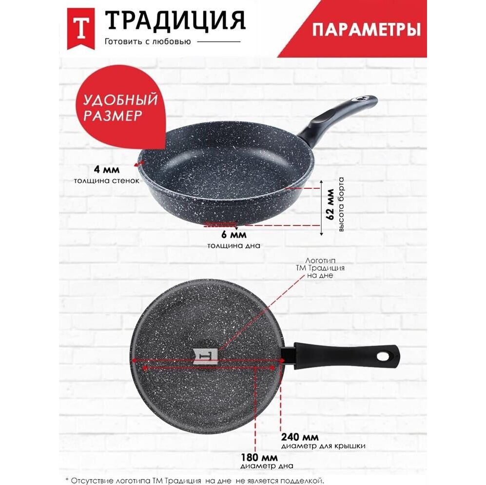 Объем, л./размер, см: 24 см Материал: литой алюминий Коллекция/серия: Гранит Торговая марка: Традиция Толщина дна: 6 Толщина стенок: 4 Источник тепла: Все виды плит, кроме индукционной Тип упаковки: цветной рукав Внутреннее покрытие: антипригарное покрытие Pfluon Внешнее покрытие: антипригарное покрытие Pfluon