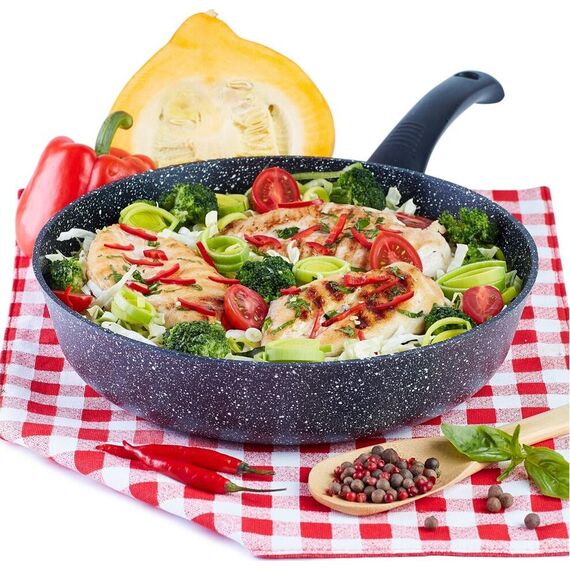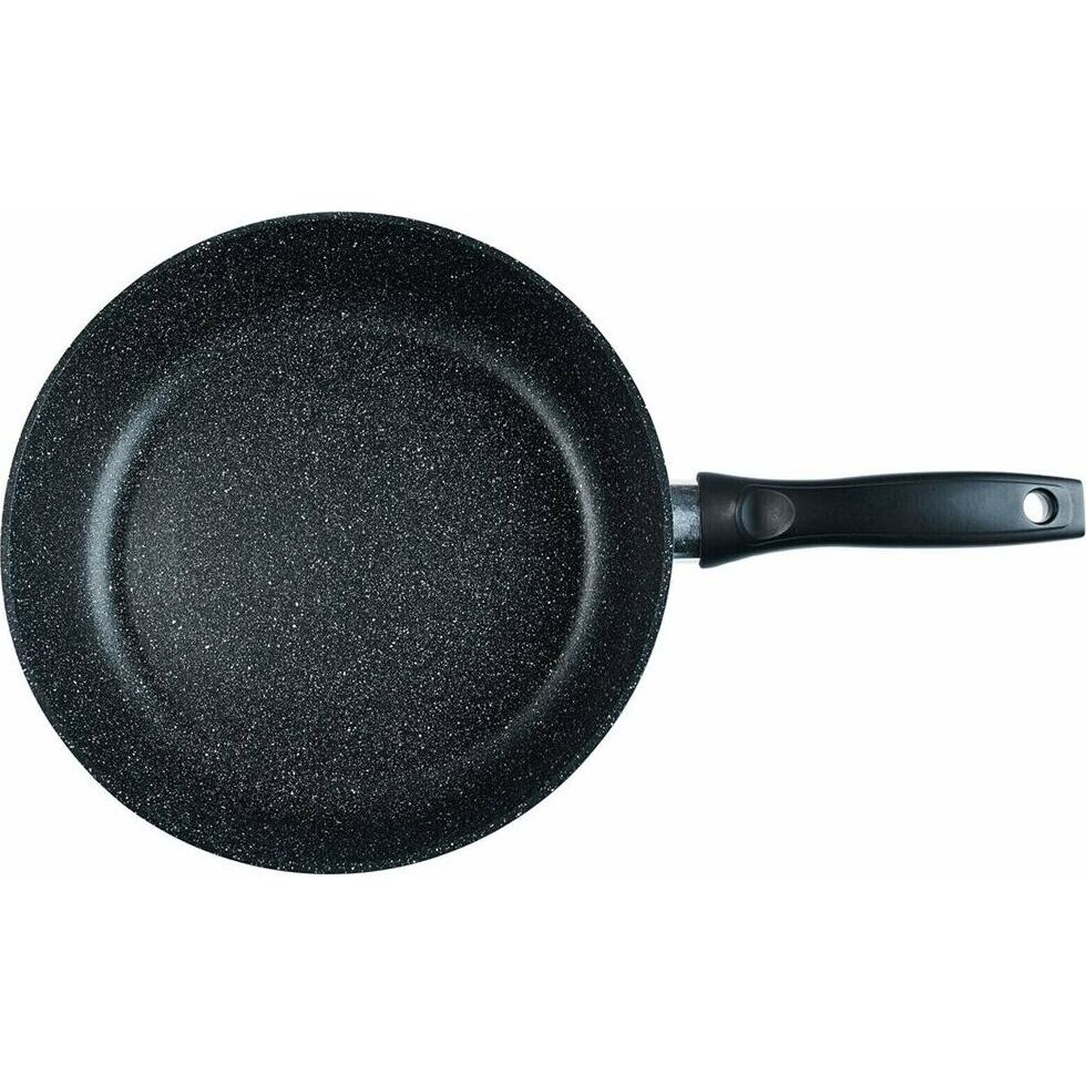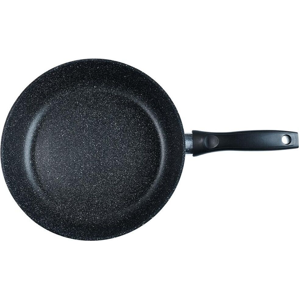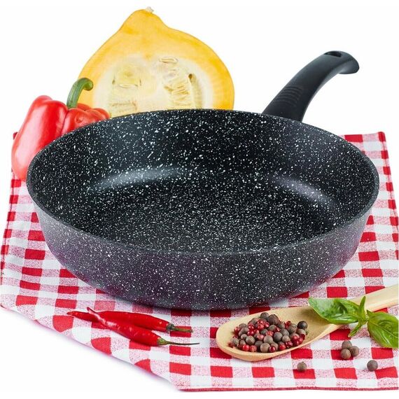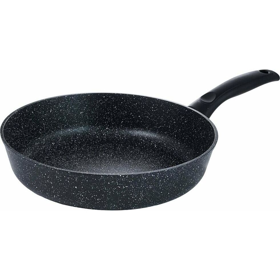 Сковорода 28 см Престиж. Материал: пищевой литой алюминий. Антипригарное мраморное покрытие. Подходит для всех тип плит, в том числе индукционных. Не нагревающиеся бакелитовая ручка легко чистится. Можно мыть в посудомоечной машине. Без крышки.