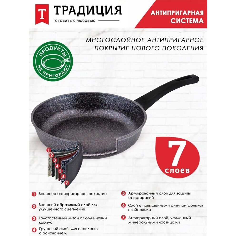Сковорода а/пр литая 22см Сапфир ТМ Традиция, мраморное покрытие, изготовлена из литого алюминия толщина стенки- 3,5 мм; Толщина дна- 5,0 мм. Подходит для всех типов плит, кроме индукционных. Можно мыть в посудомоечной машине. Произведено в РОССИИ.