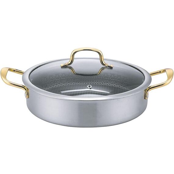 Жаровня с крышкой Z-90256 d24x6 см Allegro, Жаровня с крышкой d24x6 см, высококачественная нержавеющая сталь, 3-Х СЛОЙНЫЙ КОРПУС, ИНДУКЦИОННОЕ ДНО, ИННОВАЦИОННОЕ АНТИПРИГАРНОЕ ПОКРЫТИЕ С ЗАЩИТНОЙ СЕТКОЙ, крышка - стекло с металлическим кантом, металлические ручки «под золото», подарочная упаковка с пластиковой ручкой.
