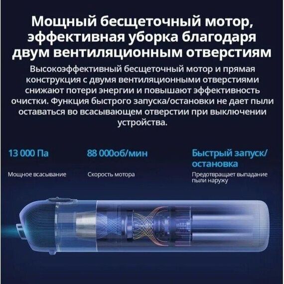 Цвет Белый Тип уборки сухая уборка Тип пылесборника контейнер Обслуживаемая площадь (кв.м.) 5 Емкость пылесборника (мл) 100 Мощность (Вт) 40 Максимальный уровень шума (дБ) 65 Управление со смартфона Нет Мощность всасывания, Па 6000 Питание Аккумулятор литий-ионный Емкость аккумулятора 2000 mA-ч Время работы (мин) 30 Время зарядки (мин) 90 Источник питания от аккумулятора Внешний вид Ширина (мм) 55 Глубина (мм) 55 Высота (мм) 267 Вес (г) 500 Материал пластик Основной блок, щелевая насадка, насадка-щетка, кабель для зарядки Type-C, адаптер, руководство по эксплуатации/