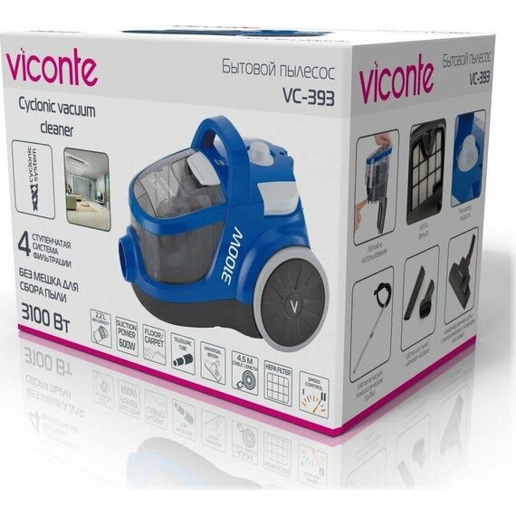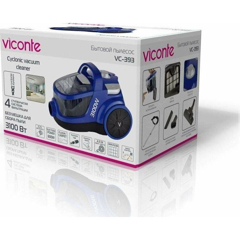VICONTE VC-393 Мощность: 3100 Вт - Объём пылесборника 2.2 л - Мощность всасывания 600 Вт - Эффективная система очистки воздуха «Циклон» с 4-ти ступенчатой системой фильтрации воздуха - Регулятор скорости на корпусе - НЕРА фильтр - обеспечивает очистку воздуха до 99,9% - Металлическая телескопическая трубка - Регулятор потока воздуха на трубке - Длина шнура питания 4,5м - Автоматическая смотка шнура - Комбинированная щётка с металлическим основанием ковёр/пол - Насадка "мебель/щель"
