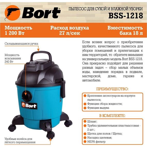 Расход воздуха 26, л/сек; пылесборник 18л; Потреб мощность 1 200Вт; Разрежение 16кПа; Сухая/влажная уборка; шланг 2м; Диаметр шланга 32мм; Мощность всасывания 240Вт; Патронный HEPA фильтр; Функция сбора жидкости; Функция выдува; кабель 2,5м; Уровень шума 78дБ; Вес 6,3кг; Напряжение 220-230В; Частота тока 50Гц