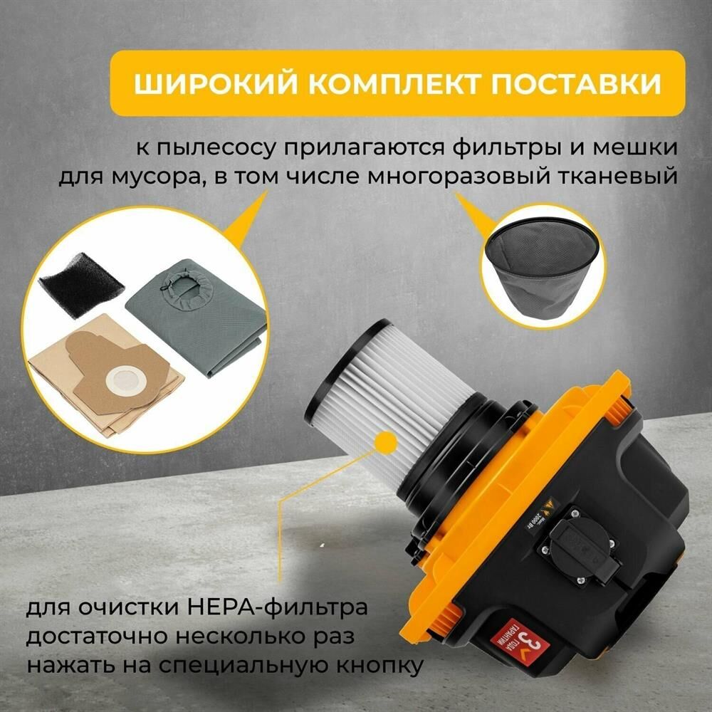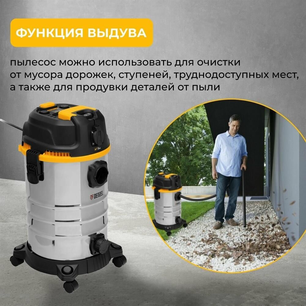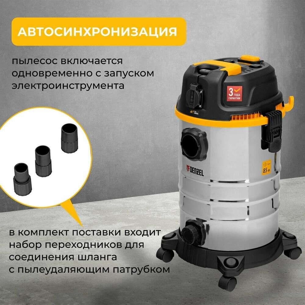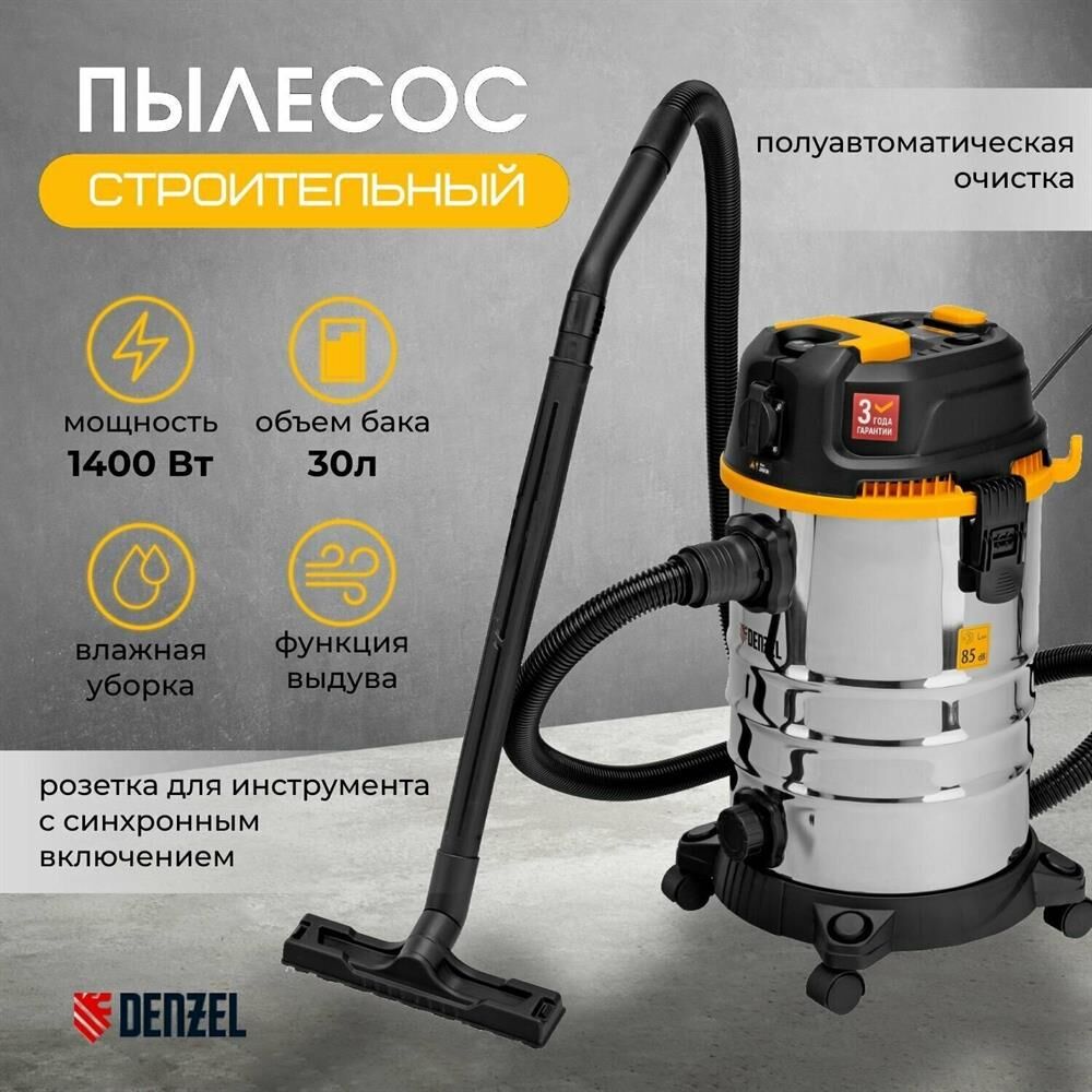 Строительный пылесос DENZEL RVC30, 1400 Вт, бак 30 л, шланг 3 м, розетка с автосинхр