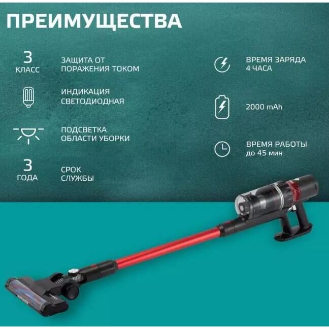 Тип пылесоса вертикальный беспроводной Мощность 380 Вт Мощность всасывания 100 Вт Регулировка мощности 3 уровня Бесколлекторный двигатель да Время непрерывной работы до 45 мин. Уровень шума 75 дБ Объем пылесборника 0,8 л. Подсветка области уборки да Индикация выбранного режима работы да Индикация уровня заряда батареи да Крепление на стену да Турбощетка с электроприводом да Щелевая насадка да Насадка для мебели да Питание Тип аккумулятора Li-Ion Съемный аккумулятор да Напряжение аккумулятора 25.9 В Емкость аккумулятора 2000 мАч Время полной зарядки до 4 часов Входное напряжение сетевого адаптера 110-240 В, 50-60 Гц Выходное напряжение сетевого адаптера 30 В, 500 мА Защита от поражения электрическим током класс 3 Корпус Цвет красный/серебро Вес 2.3 кг. Вес с упаковкой 3.5 кг. Размеры (ШхВхГ) 250x1080x218 мм. Размеры упаковки (ШхВхГ) 630х255х130 мм.