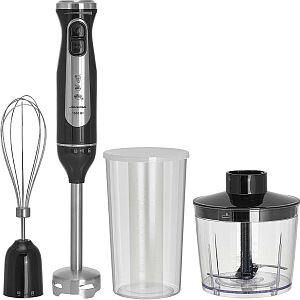 Параметры Максимальная мощность 1500 Вт Номинальная потребляемая мощность 600 Вт Объем чаши измельчителя 500 мл Объем мерного стакана 700 мл Описание Блендер электрический предназначен для смешивания, измельчения и взбивания продуктов и жидкостей в бытовых и аналогичных условиях Ножи из нержавеющей стали Три сменные насадки: насадка для смешивания венчик для взбивания измельчитель Мерный стакан Противоскользящие ножки чаши измельчителя Плавная регулировка скорости Режим «ТУРБО» Цвет: черный Упаковка: цветная коробка