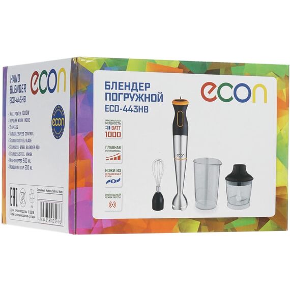 Блендер погружной, максимальная мощность 1000 Вт, импульсный режим работы, 2 скорости, насадка-блендер из нержавеющей стали, съемная насадка-венчик из нержавеющей стали, мини-измельчитель 500 мл, мерный стакан 500 мл, цвет черный со стальным
