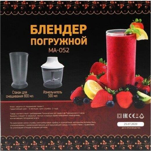 2 скорости работы. Ножи из нержавеющей стали. Пластиковая насадка блендер. Мощность 350Вт. Измельчитель 500 мл. Стакан для смешивания 800 мл.