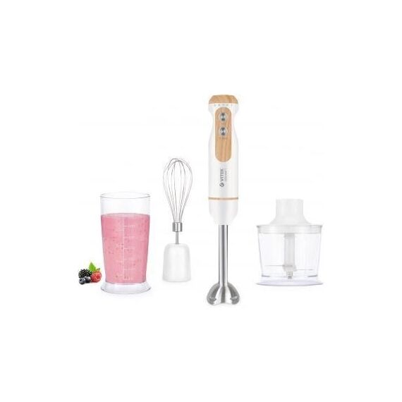 Блендер погружной. Мощность: 1200 вт, Количество скоростей: 5, Турборежим, Плавная регулировка скорости, Управление: механическое, Материал корпуса: пластик, Материал погружной части: нержавеющая сталь, Емкость измельчителя: 500 мл, Емкость мерного стакана: 700 мл, Венчик для взбивания, Мерный стакан, Длина сетевого шнура: 130см, Измельчитель, Цвет: Белый/ольха