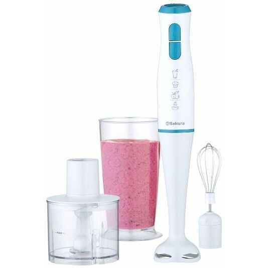 600 Вт, мощный и тихий DC мотор, 2 скорости работы, лезвия из нерж.стали, погруж.часть блендера из пластика, насадка-венчик из стали, градуированный стакан (0,7 л), чоппер (0,5 л) с острыми ножами из нерж.стали