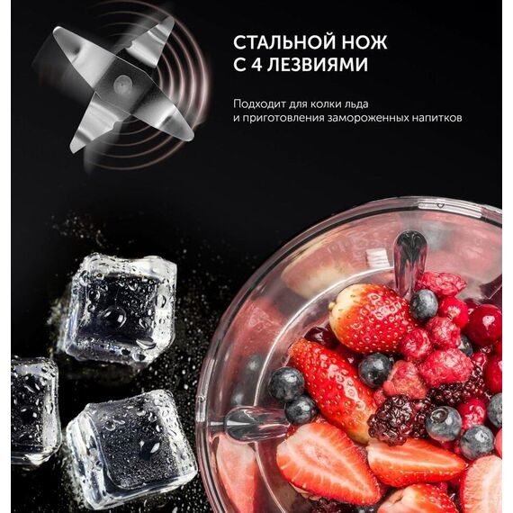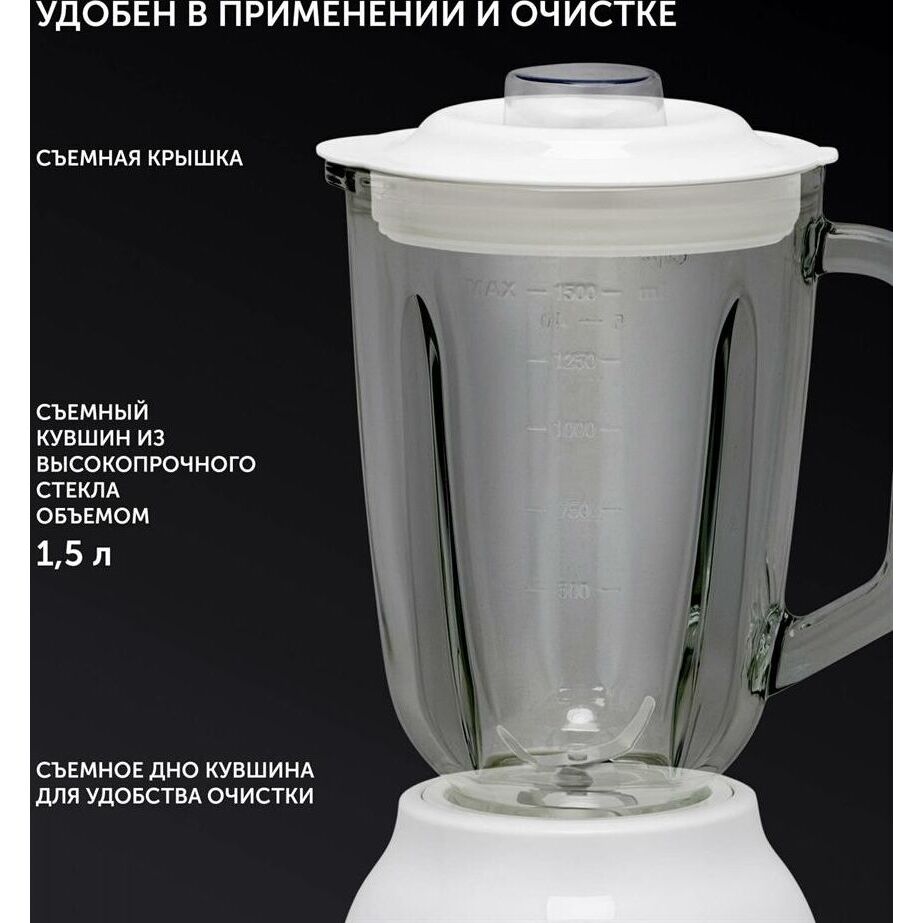 Мощность 800 Вт.Объем кувшина,1500 мл.Двусторонняя шкала уровня наполнения. 4 скоростных режима.Импульсный режим.Стальной нож с 4 лезвиями. Специальное отверстие в крышке для добавления ингредиентов в процессе работы. Специальная форма ножей для эффективного перемешивания.Подходит для колки льда и приготовления замороженных напитков.Компактный мини-измельчитель для перемалывания зёрен кофе, приготовления небольших порций соусов, дробления орехов, измельчения пряных трав и овощей.Съемное дно кувшина для удобства очистки.Cъемная крышка.Прорезиненные нескользящие ножки.Удобен в применении и очиcтке.
