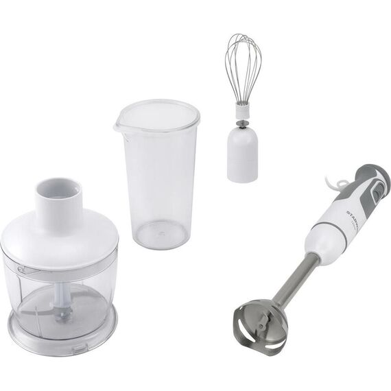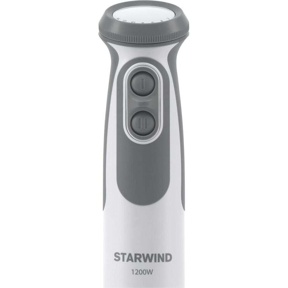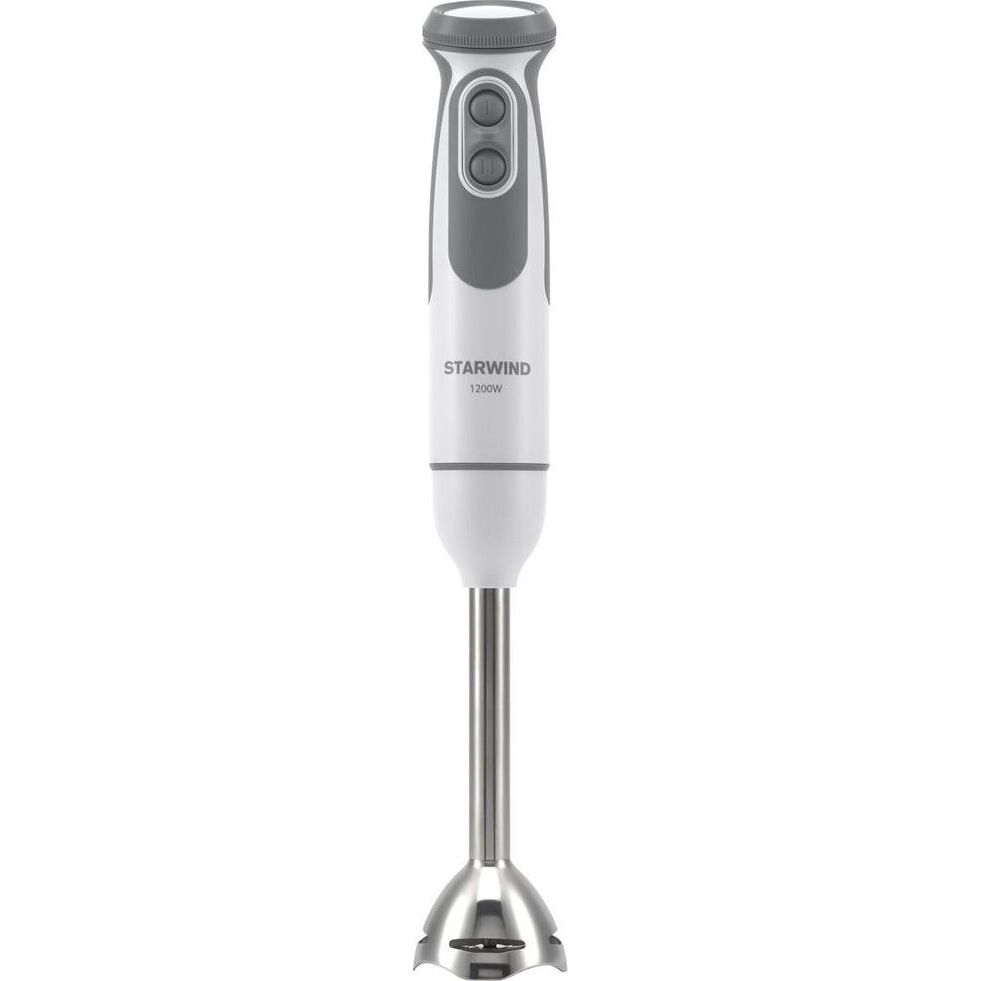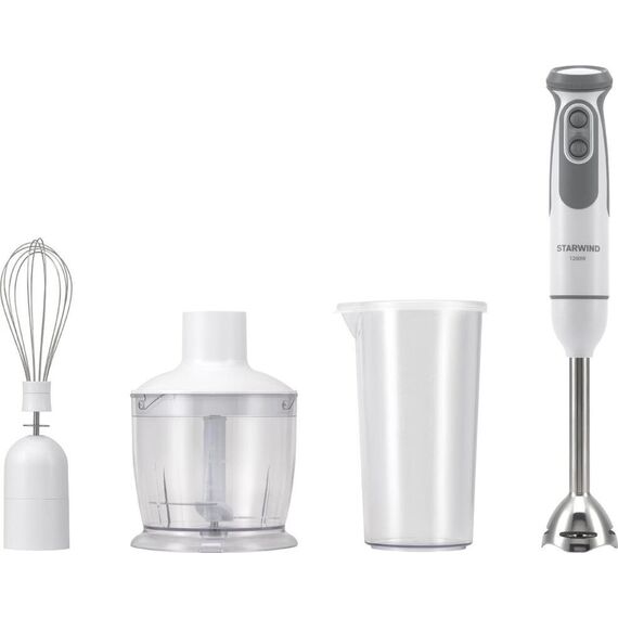 Блендер погружной. Мощность: 1200 Вт, Бесступенчатый регулятор скорости, Регулировка скорости вращения, Турборежим, Электропитание от сети, Материал корпуса: пластик, Материал ножей: нержавеющая сталь, Материал погружной части: нержавеющая сталь, Длина сетевого шнура: 1,45 метра, В комплекте: Венчик для взбивания, Измельчитель, Мерный стакан, Цвет: белый/серый, Вес: 1,33 кг, Срок гарантии: 12 месяцев.