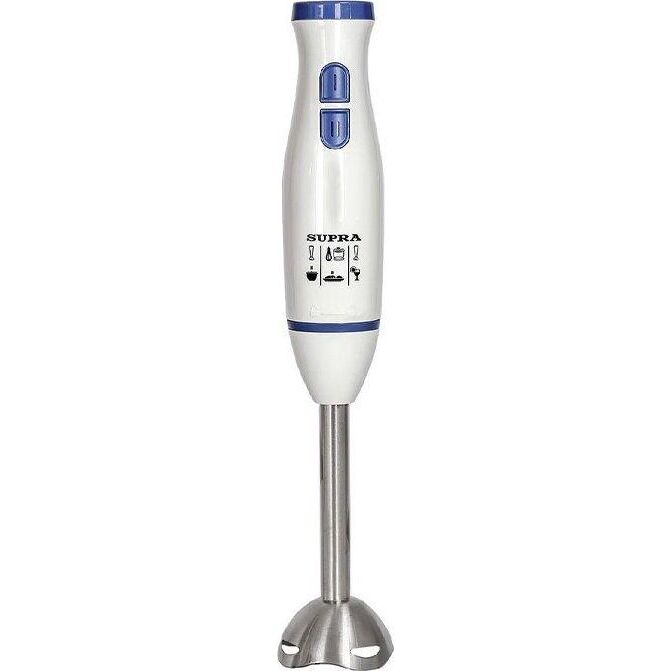 SUPRA HBS-698 Основные характеристики Мощность, Вт. 700 Количество скоростей 2 Материал погружной части нержавеющая сталь Комплектация: блендер, съемная насадка-венчик, мерный стакан 500 мл, измельчитель 500 мл, гарантийный талон, инструкция на русском языке Корпус: Материал корпуса пластик Цвет белый с синим Энергопотребление Электропитание, в., Гц. 220-240, 50
