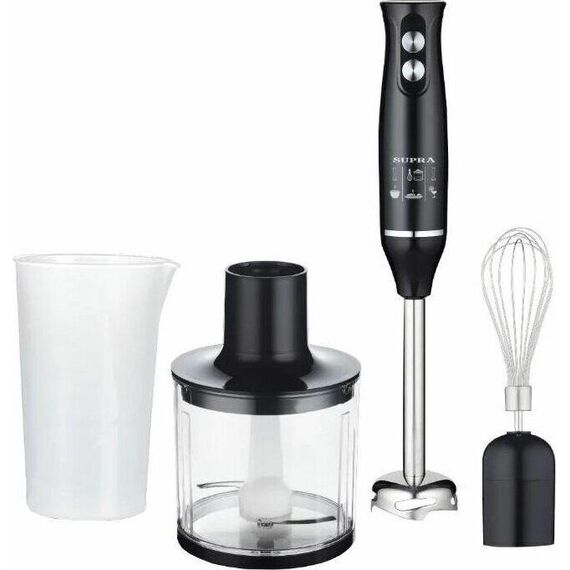 Погружной блендер, мощность 950W, пульсовый режим работы, 2 скорости, металлическая нога блендера, венчик для взбивания, чаша объемом 1250 мл с ножом из 4 лезвий для рубки и измельчения, автоматическая блокировка при неправильно установленной насадке.