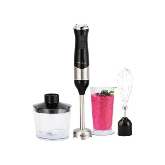 Блендер Мощность: 1500Вт Мерный стакан: 700мл Чаша измельчителя : 500 мл Число скоростей: 2 Плавный регулятор мощности Удобная эргономичная ручка Ножи из нержавеющей стали Металлическая погружная часть Венчик для взбивания 220-240 В, 50\ Гц Размеры: 23,4см*24,5см*16,6см