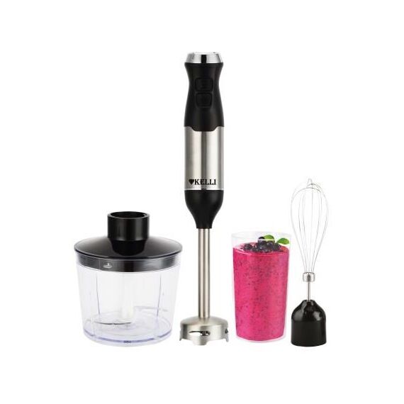 Блендер Мощность: 1500Вт Мерный стакан: 700мл Чаша измельчителя : 500 мл Число скоростей: 2 Плавный регулятор мощности Удобная эргономичная ручка Ножи из нержавеющей стали Металлическая погружная часть Венчик для взбивания 220-240 В, 50\ Гц Размеры: 24см*24,5см*16,6см