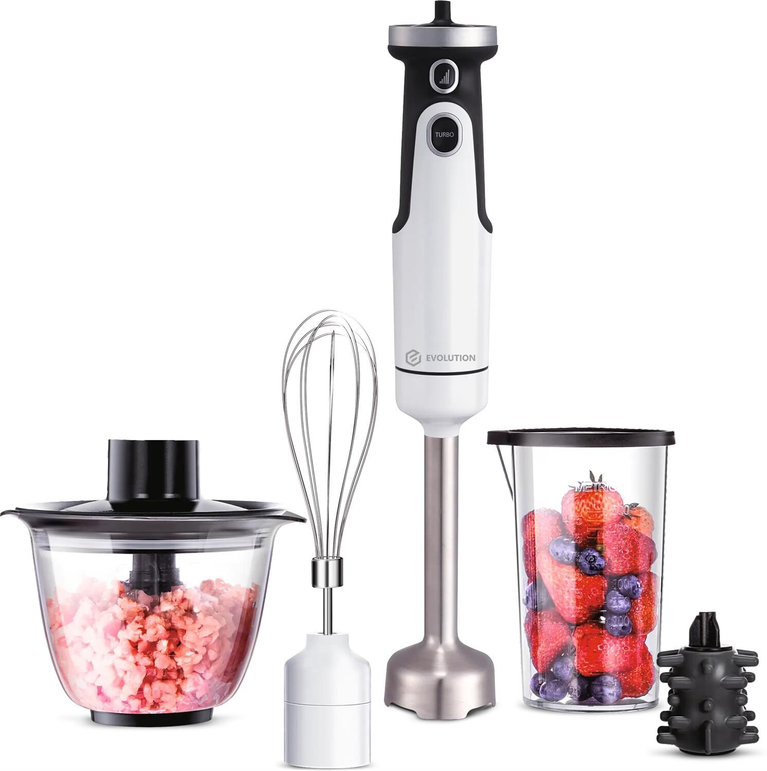 600 Вт, 8 скоростей, многоступенчатая регулировка скорости,Турборежим.Измельчитель с острым S-образным ножом с 4 лезвиями.Насадка-блендер.Насадка-венчик.Специальная насадка для чистки чеснока. Стакан с крышкой на 500 мл