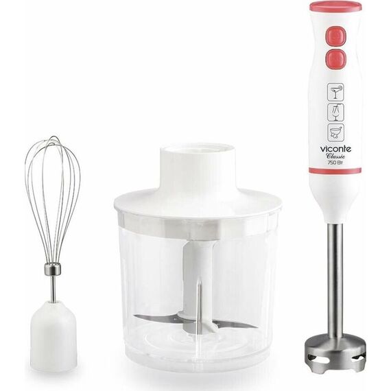 Погружной блендер, мощность 750W, современный эргономичный дизайн, пульсовый режим работы, 2 скорости, режим "Турбо", лезвия из нержавеющей стали, металлическая нога блендера, венчик для взбивания, чаша с ножом для рубки и измельчения, 400 мл; автоматичес