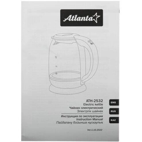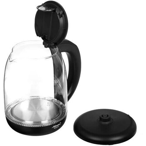 ATLANTA ATH-2532 (BLACK) 5 режимов нагрева - 60-70-80-90-100°С 5 цветов температурной иллюминации Объем 1,7 литра Корпус из термостойкого стекла Шкала уровня воды Поворот на подставке на 360° Быстрое закипание Фильтр от накипи Закрытый нагревательный элемент Автоматическое отключение Защита от перегрева без воды Электрошнур в цокольной подставке, 66см Мощность 1850-2200 Вт 220-240 B ~ 50/60 Гц