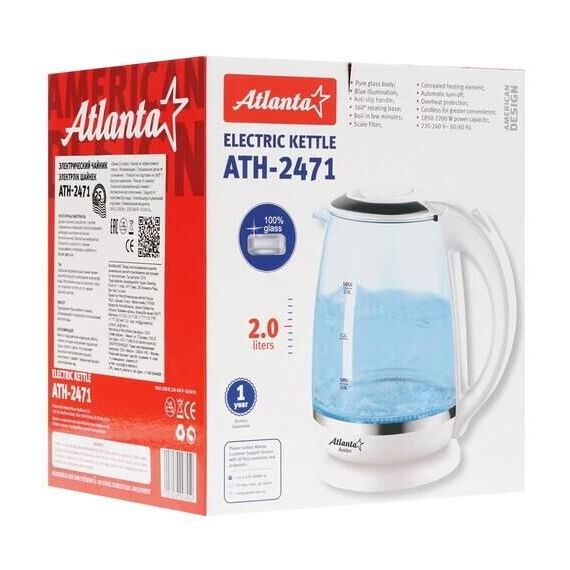 ATLANTA ATH-2471 (WHITE) Чайник стеклянный электрический Объем 2.0 литра Корпус из термостойкого стекла Иллюминация Специальная ручка от скольжения Поворот на подставке на 360° Быстрое закипание Фильтр от накипи Закрытый нагревательный элемент Автоматическое отключение Защита от перегрева без воды Электрошнур в цокольной подставке. 67см Номинальная мощность 1850-2200 Вт 220-240 B ~ 50/60 Гц