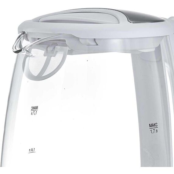 Объем 1,7 л Номинальная мощность 2200 Вт Описание Закрытый нагревательный элемент из нержавеющей стали Корпус из жаропрочного стекла Вращение корпуса на 360° Шкала уровня воды Внутренняя LED-подсветка Съемный фильтр Удобное хранение шнура Цвет: белый Многоуровневая защита: автоматическое отключение при закипании отключение при снятии чайника с базы отключение при недостаточном количестве воды