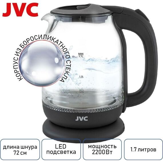 Чайник электрический, объем 1,7л, максимальная мощность 2200 Вт, круговая светодиодная подсветка, волнообразный рисунок стеклянного корпуса, декоративная вставка на крышке, фильтр от накипи, защита от включения без воды, автоматическое отключение при закипании, вращение на 360 градусов, хранение электрошнура в подставке, материал корпуса: боросиликатное стекло.