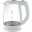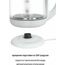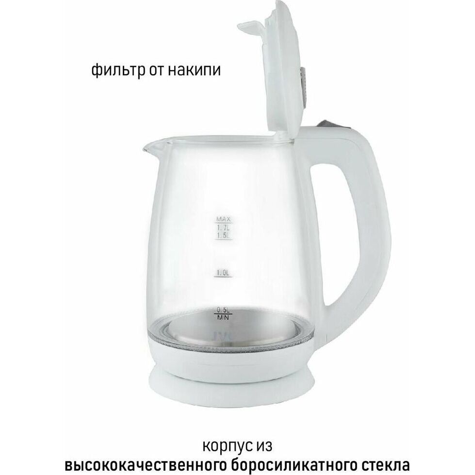 Чайник электрический, объем 1,7л, максимальная мощность 2200 Вт, светодиодная подсветка, ручное открывание крышки, фильтр от накипи, защита от включения без воды, автоматическое отключение, индикация включения, индикатор уровня воды, подставка с возможностью вращения на 360 градусов, хранение электрошнура в подставке, материал корпуса: боросиликатное стекло