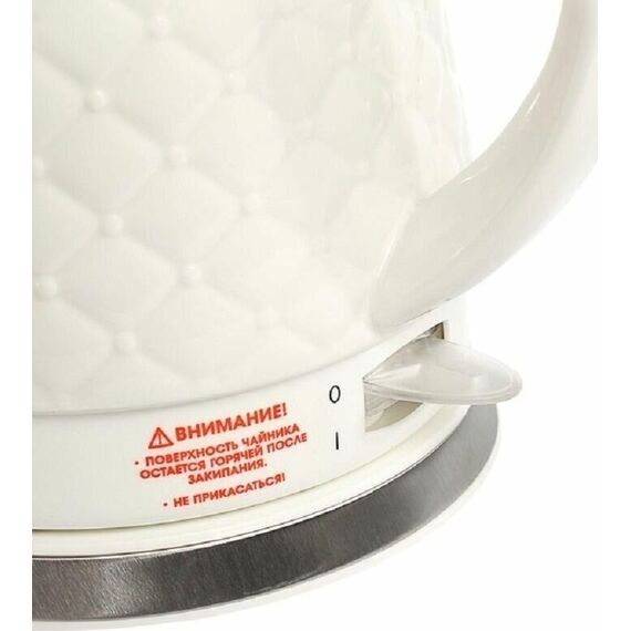 Керамический электрический чайник Объем: 1,8л. 220-240В, 50Гц, 1850-2200Вт Автоматическое отключение Поворачивающийся корпус на 360° Закрытый нагревательный элемент Защита от перегрева Световой индикатор включения Съемная крышка Удобный носик
