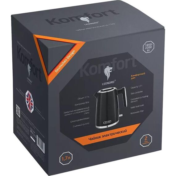 Мощность 1850-2200 Вт Объем 1,7 л Корпус из пластика Закрытый нагревательный элемент из нержавеющей стали Поворот на подставке 360° Защита от работы без воды Автоматический выключатель Шкала уровня воды Световой индикатор работы Съемный фильтр Контроллер STRIX (Англия) Гарантия 2 года Длина шнура 77 см